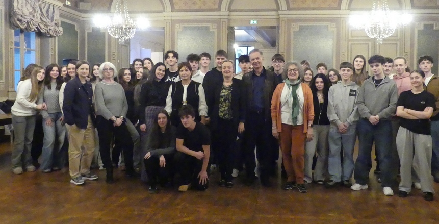 La municipalité de Mâcon et le Comité de Jumelage ont accueilli ce mardi 10 mars en Mairie, 30 jeunes de Lecco, la ville italienne jumelée avec Mâcon et leurs correspondant.e.s du lycée Lamartine. C'est dans le cadre du programme Esabac, le Bac Franco-Italien créé en 2011, que les 3èmes années du lycée de Manzoni accompagnées de leur professeure Rosa Chichi passent la semaine à Mâcon, hébergées chez des familles d'accueil. Au programme : La découverte du lycée et le système français, cours, visites culturelles et bien sûr, des moments de convivialité. La délégation franco-italienne accompagnée du proviseur du lycée Lamartine Monsieur Coquegnot et de l'organisatrice du séjour Sylvie Massault, professeure de littérature italienne au Lam a été accueillie mardi soir au Grand salon de l'Hôtel de Ville. Émilie Clerc, adjointe au maire de Mâcon en charge des relations internationales, a évoqué dans son discours l'idéal européen et l'amitié franco-italienne : « Tout dans l'histoire et dans le présent de la ville de Mâcon rappelle à quel point l'échange et la découverte de l'autre constituent une part de notre identité. Nous avons trouvé dans les habitants de Lecco des interlocuteurs qui partagent ces mêmes valeurs et avec lesquels nous faisons vivre ces idéaux... Aujourd'hui, nous réunissons à nouveau des jeunes de nos deux villes, démonstration que notre histoire commune est riche et que nos échanges se renouvellent. Jeunes de Lecco et de Mâcon, par votre présence ici ce soir, vous prenez le relais de nos liens. Je forme le vœu que les amitiés qui se forgeront lors de ce séjour se prolongent dans le temps et participent à la construction de ce jumelage. » Le président du comité de jumelage Gino Ceddia a souligné que « l'Europe d'abord économique et politique est devenue une Europe de la paix, de l'amitié et de la jeunesse. Vous en êtes un parfait exemple. » Et il a conclu sur ces mots : « Profitez pleinement de cette expérience ! Explorez notre belle ville de Mâcon, partagez vos traditions et découvrez celles de vos amis français et italiens. Vous êtes les citoyens de demain. C’est par des initiatives comme celle-ci que nous construisons ensemble un avenir plus ouvert et solidaire. Vive l'amitié franco-italienne, Vive l'Europe ! » Maryse Amélineau